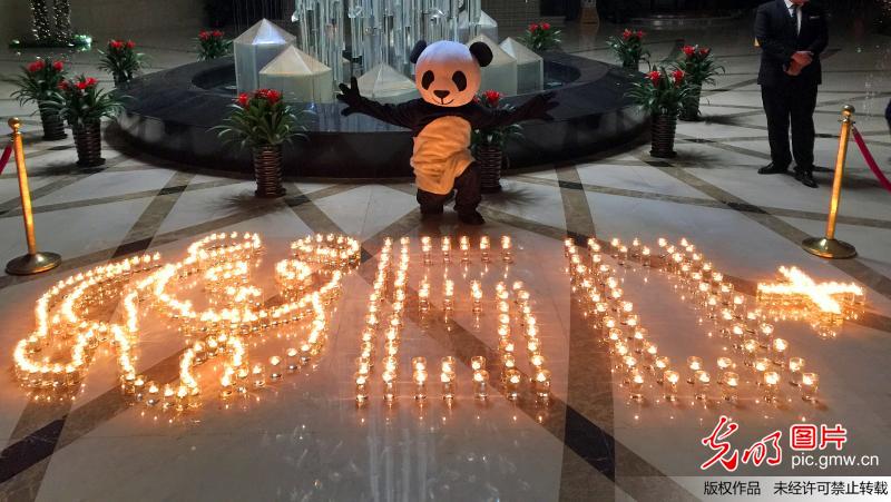 2018年3月24日,在山东省烟台市皇冠假日酒店,扮成大熊猫的酒店工作人员在蜡烛摆成的"60+"字样前拍照。