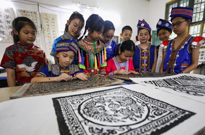 2023年6月9日,湖南省怀化市通道侗族自治县第一完全小学,学生在老师指导下用版画制作侗锦,近距离感受家乡的非遗文化。(胡贤兵摄/光明图片)