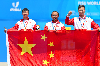 2023年7月30日,中国队选手杜美余(中)、陈岩松(左)、王世坤(右)获射箭男子复合弓团体决赛金牌。(光明日报记者郭俊锋摄/光明图片)