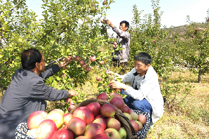 在滦平县狼山顶中草药种植园,游客在采摘成熟的苹果。(梁志青摄/光明图片)