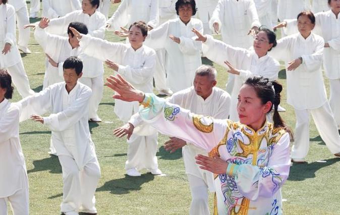 2023年8月8日,辽宁省大连市甘井子区1000余名健身爱好者展演健身气功运动。(刘德斌摄/光明图片)