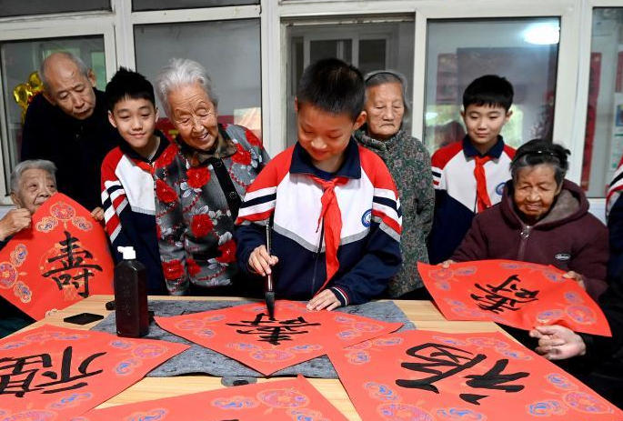 2025年10月28日,河北省邯郸市邯山区开元小学的学生为邯山区阳光敬老服务中心的老人们书写"福""寿"大字。(郝群英摄/光明图片)