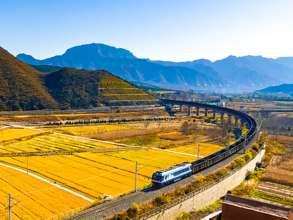 2025年11月2日,山西省晋中市左权县桐峪镇马家楼村,一列火车沿弯道驶过,与金色稻浪共同绘出一幅秋日田野的诗意画卷。(张文军摄/光明图片)
