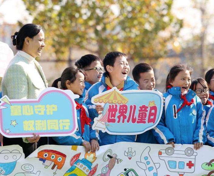 2025年11月20日,山东省临沂市郯城县第三实验小学的老师正在为学生们讲解世界儿童日有关知识。(张春雷摄/光明图片)