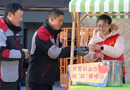 2025年12月5日,江苏省海安市墩头镇组织青年党员志愿者开展"冬日暖‘新’"志愿服务活动,通过送上爱心早餐、"健康礼包"等形式,为寒冬里辛勤奔波的快递小哥、货车司机等新就业群体送去关爱与温暖。(周强摄/光明图片)
