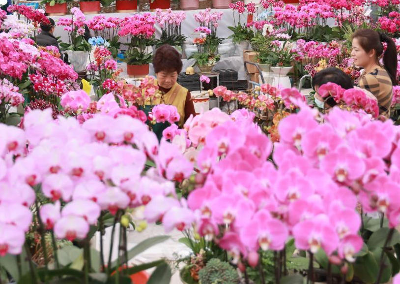 2025年12月24日,在山东省临沂市郯城县郯城街道台创花博园,顾客在选购蝴蝶兰。(张春雷摄/光明图片)
