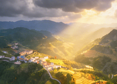 2025年12月9日,位于贵州省黔东南苗族侗族自治州月亮山腹地的从江县加勉乡上空出现 “丁达尔” 现象。阳光穿透云层,形成一道道金色光束,与连绵山峦、城镇、村落、梯田、公路相映成景,宛如秘境。(吴德军摄/光明图片)