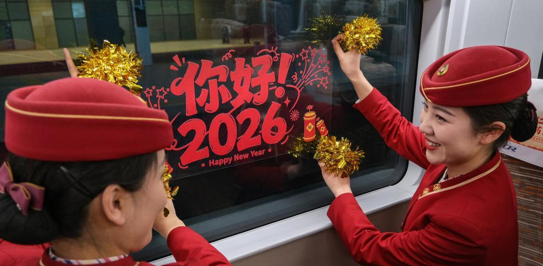 2025年12月30日,C2026次列车上乘务人员布置车厢粘贴迎新年窗贴。(杨宝森摄/光明图片)