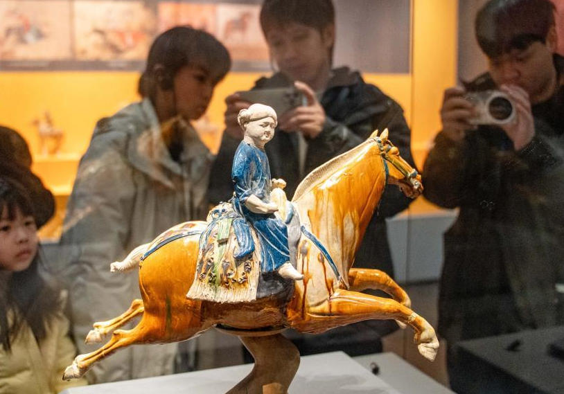 2026年2月11日,陕西西安博物院内,市民游客带孩子参观国家一级文物唐代三彩腾空马。(张成摄/光明图片)