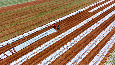 2026年3月5日,山东省临沂市平邑县保太镇农民在田间为种植的土豆覆盖地膜。(武纪全摄/光明图片)