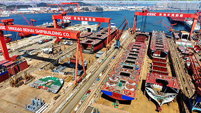 2026年4月8日,中国船舶集团青岛北海造船有限公司,造修船现场一派繁忙景象。(俞方平摄/光明图片)