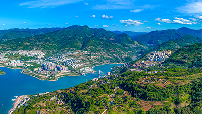 云南省昭通市,金沙江流域下游绥江段天蓝、水碧、山清、岸绿,一派春意盎然,景美如画